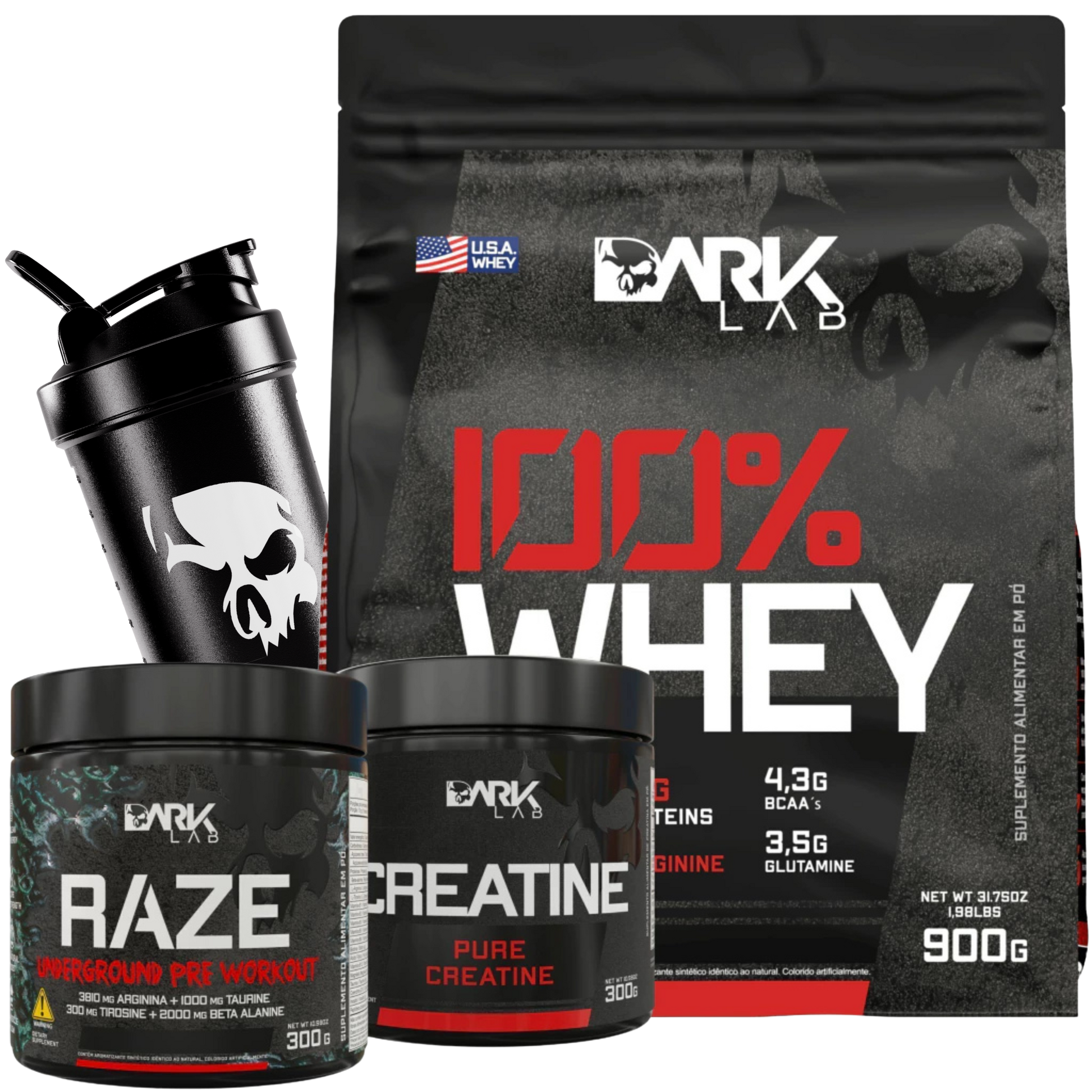 Transforme seus treinos com o Kit Potência Dark Lab, a combinação perfeita para quem busca hipertrofia, força e máxima performance! Este kit reúne três suplementos premium da Dark Lab: 100% Whey Protein Refil 900g, Raze Underground Pré-Treino 300g (sem cafeína) e Creatina Monohidratada 300g — tudo que você precisa para elevar seu desempenho, aumentar sua massa magra e acelerar a recuperação muscular.