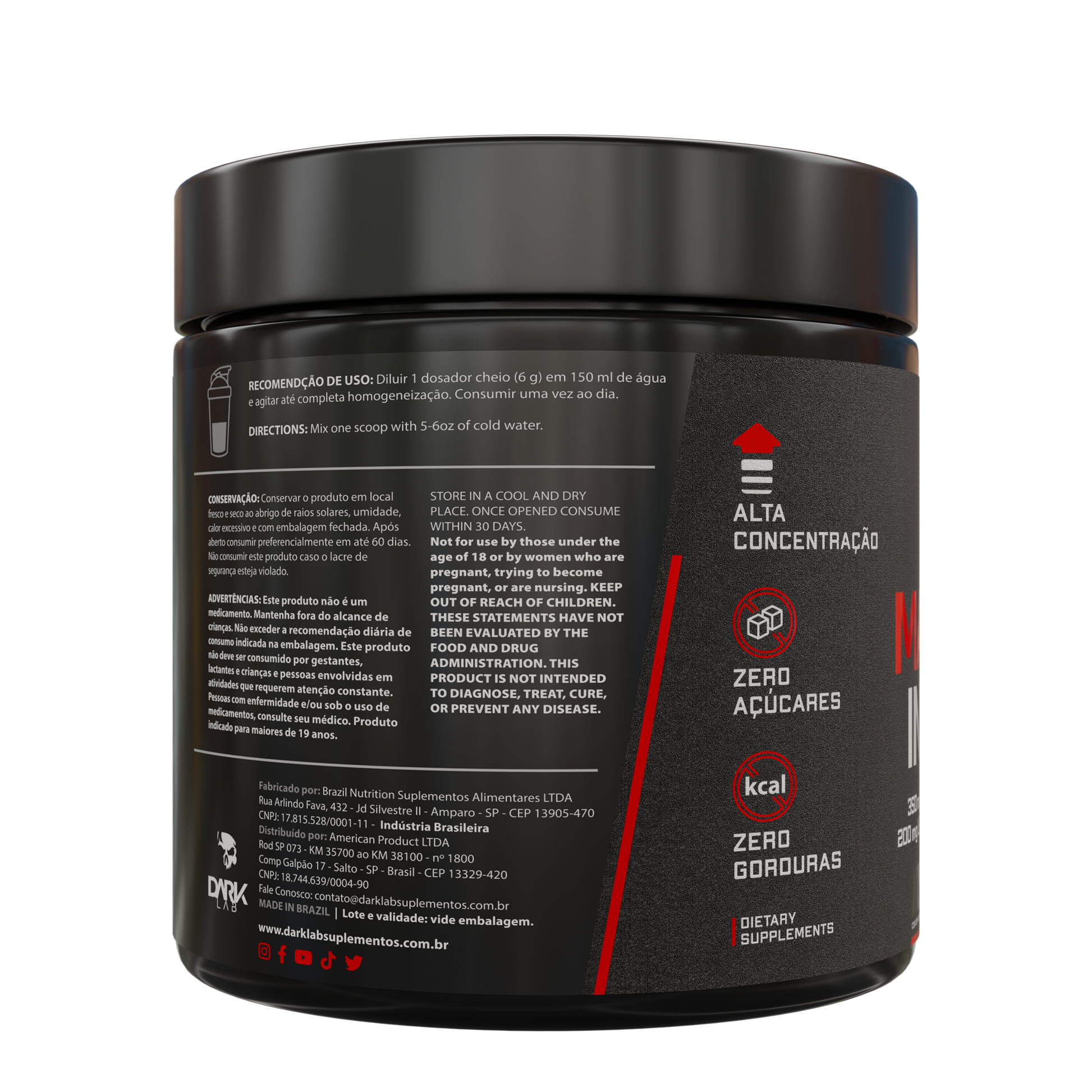 O Magnésio Inositol Dark Lab combina magnésio, inositol, glicina, taurina, triptofano e melatonina para proporcionar sono profundo, recuperação muscular e equilíbrio mental.